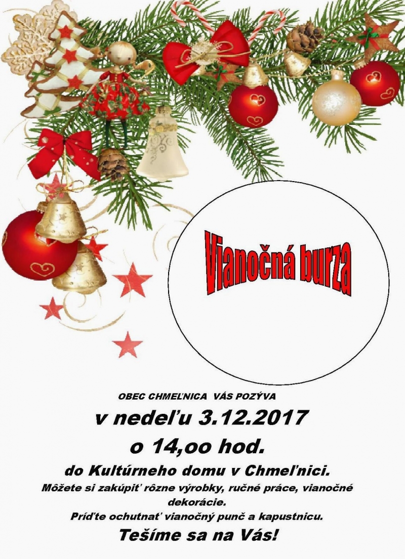 Už tradične sa uskutoční Vianočná burza 2017 v Chmeľnici. Pozývame záujemcov, ktorí vyrábajú rôzne výrobky, aby sa nahlásili u pani Ľudmily Kaňovej na tel č: 052/4324894. Na podujatí budete môcť ochutnať vianočnú kapusnicu a vianočný punč.