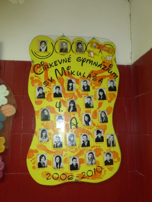 Keď sme prešli po chodbe, na dverách 4.A som našla aj postavičky dvoch našich maturantiek z Chmeľnice. Na tablách, ktoré zdobia steny chodby gymnázia som našla fotky absolventov školy z Chmeľnice. Úplne ma dostala jazyková učebňa, keď mi Mgr. Mária Fabianová, angličtinárka gymnázia ukázala cez interaktívnu tabuľu akými modernými metódami sa vyučuje anglický jazyk na gymnáziu. Zatúžila som sa opäť vrátiť do školských lavíc a tak trochu závidím žiakom, pretože my sme také možnosti vzdelávania hlavne v oblasti cudzích jazykov, keď sme drali školské lavice, nemali.