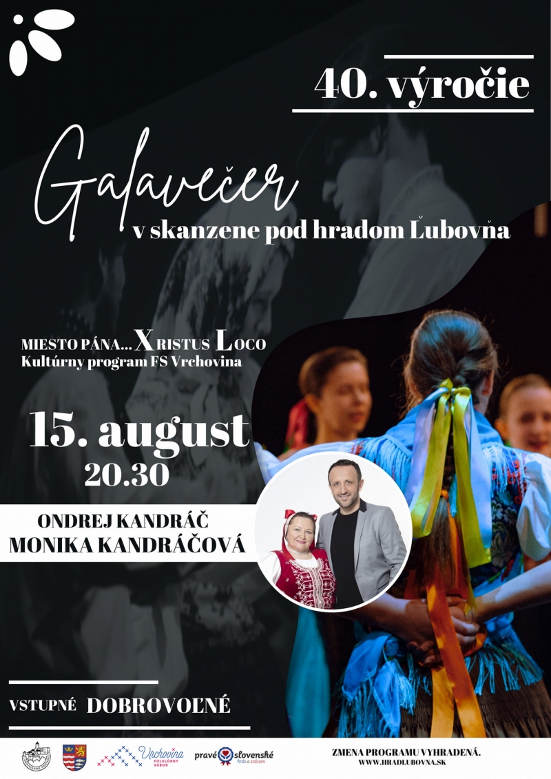 Večerný program otvorí folklórny súbor Vrchovina s predstavením Xristus Loco – Miesto Pána. Následne vystúpia Ondrej Kandráč a Monika Kandráčová, ktorí svojim koncertom umocnia výnimočnú atmosféru historického prostredia pod hradom.