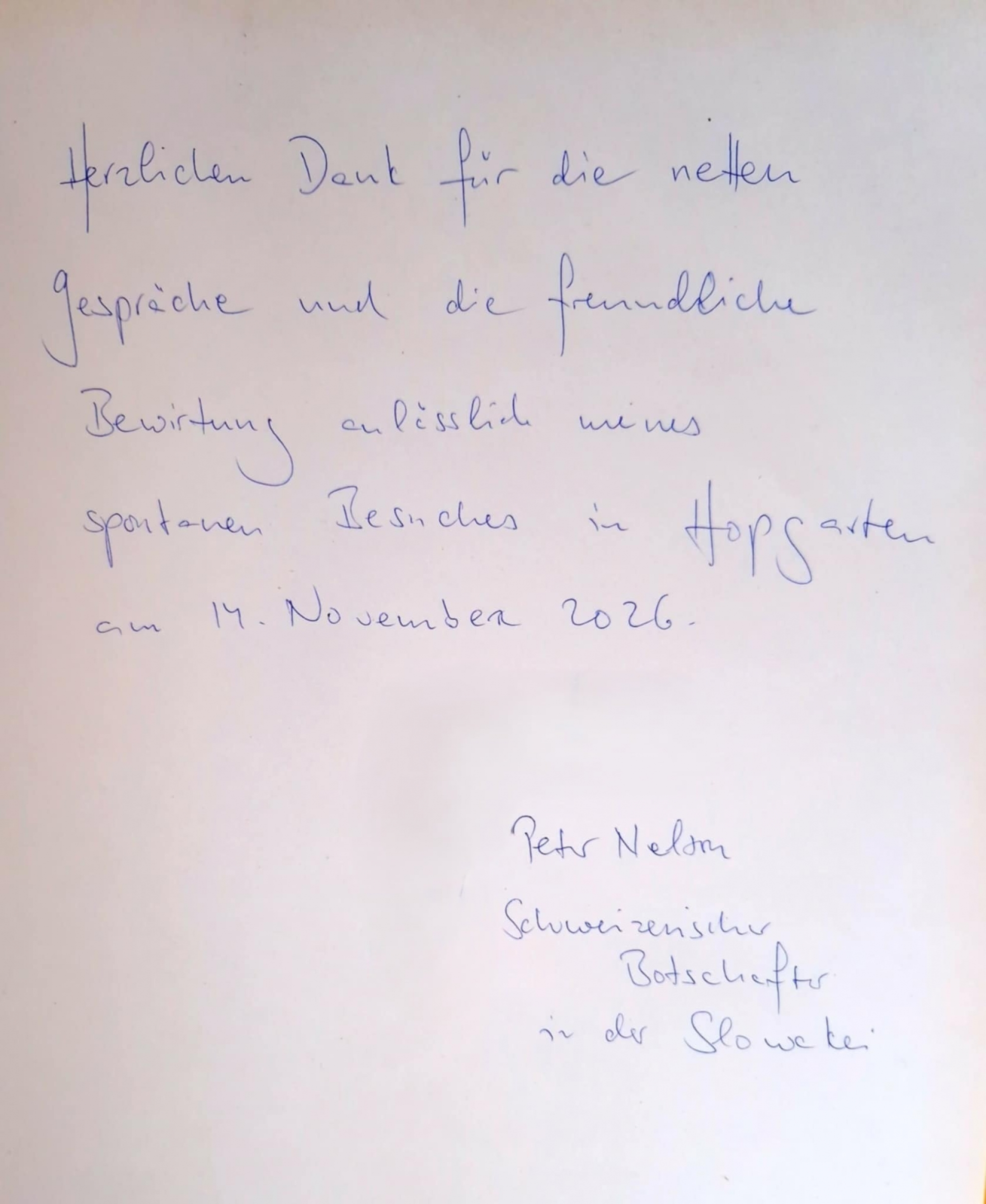 Dňa 14.11.2025 zavítal na Obecný úrad v Chmeľnici Jeho Excelencia Peter Nelson, veľvyslanec Švajčiarskej konfederácie, a to úplne neplánovane a neoficiálne. Jeho návšteva bola milým a príjemným prekvapením pre zamestnancov obecného úradu. Jeho Excelencia pôsobí na Slovensku od roku 2022 a výborne ovláda slovenský jazyk.