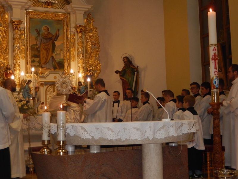Veľkonočná vigília sa začala v sobotu večer posvätením ohňa a veľkonočnej sviece - Paškálu. Táto svieca je stredobodom veľkonočnej slávnosti. Od nej sa zapálili sviece najprv miništrantom a tí zapálili sviece, ktoré si priniesli veriaci.Procesia s Paškálom pripomína slová samotného Krista: "Ja som svetlo sveta, kto mňa nasleduje, nebude chodiť v tmách, ale bude mať svetlo života".