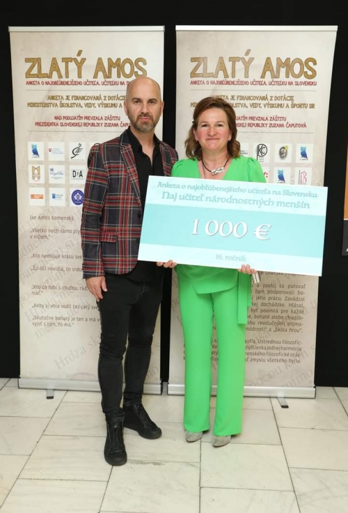 Ocenenie riaditeľky ZŠ s MŠ v Chmeľnici Mgr. Ľudmily Klimkovej - Zlatý Amos