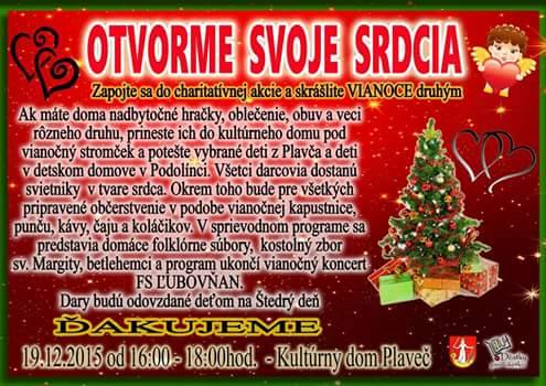 Naša výzva, ktorú sme na našej stránke uverejnili 10. decembra 2015 oslovila Majku Kyšeľovú a Helenu Liptákovú, ktoré si želajú, aby šťastné a veselé Vianoce mali aj deti v domove v Podolínci. Hoci majú Helenka a Marek Liptákovci štyri deti, neváhali a priniesli nám hračky, ktoré 19. decembra 2015 zanesieme do Plavča. Tieto hračky dostanú deti v detskom domove v Podolínci na Štedrý deň pod vianočný stromček. Ďakujeme darcom! Je skvelé, keď sa deti vzdajú svojich obĺúbených hračiek, aby potešili svojich kamarátov.Určite bude pre nich odmenou veľa milých úsmevov detí v domove s iskierkou v oku.
