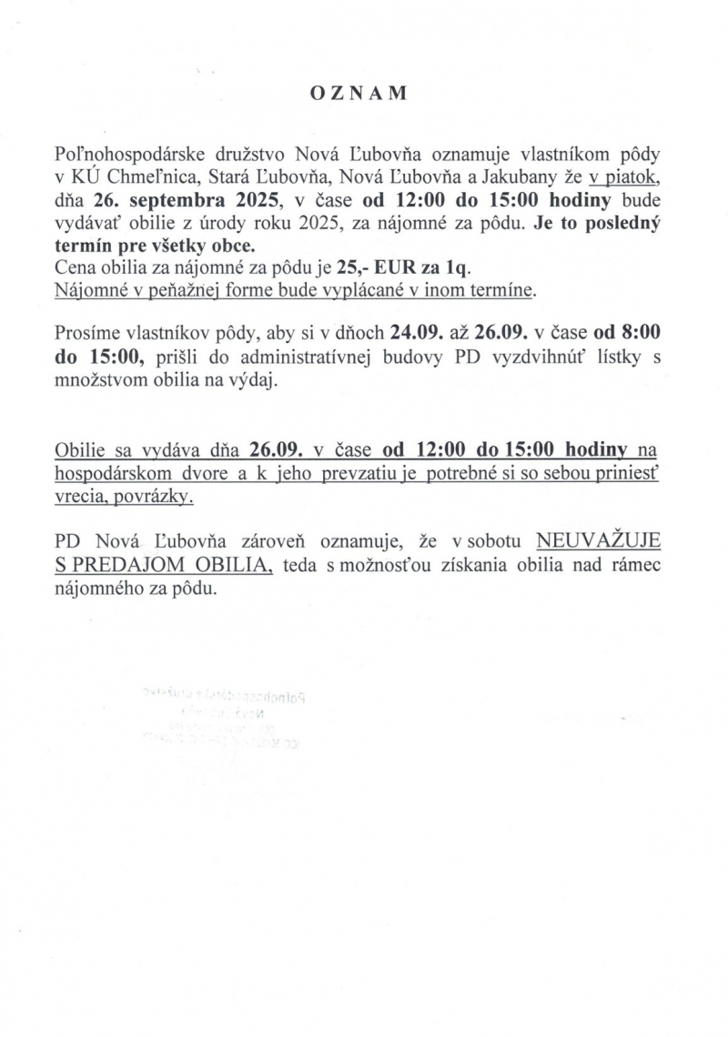 Oznam o vydávaní naturálií - PD Nová Ľubovňa - posledný termín