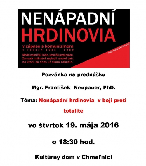 Vo štvrtok 19. mája 2016 o 18:30 hod v Kultúrnom dome v Chmeľnici sa uskutoční prednáška Nenápadní hrdinovia v boji proti totalite." Srdečne pozývame mladých aj starších, ktorí sami prežívali tento boj.
