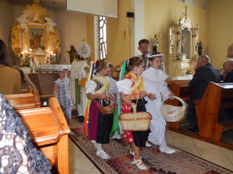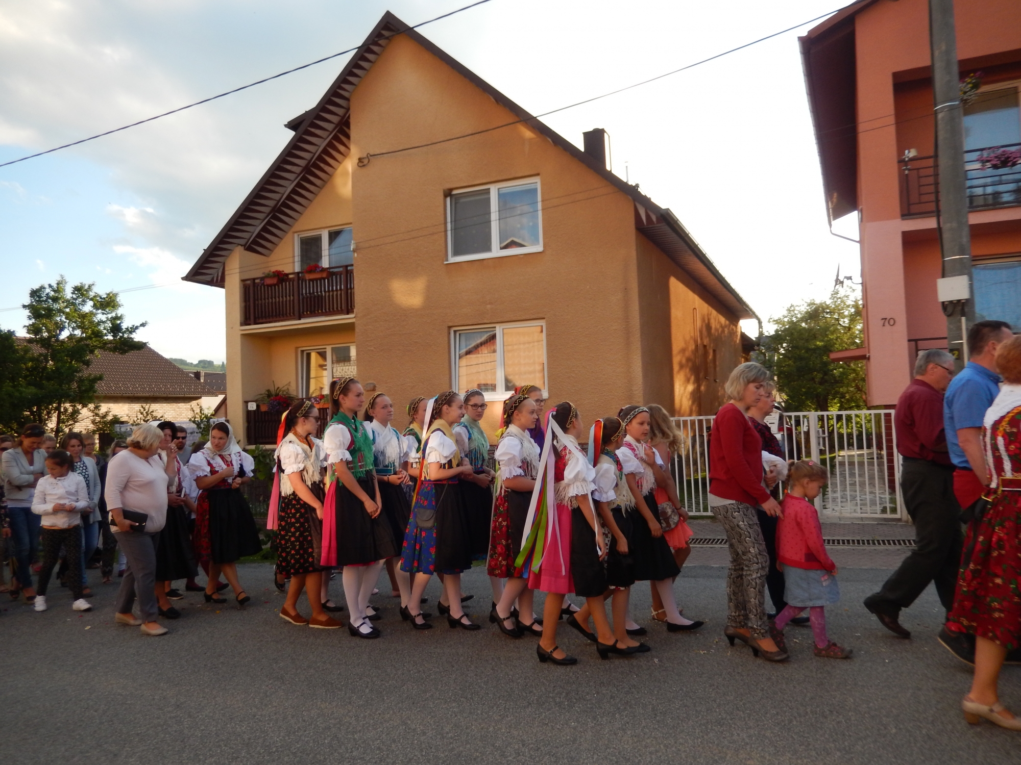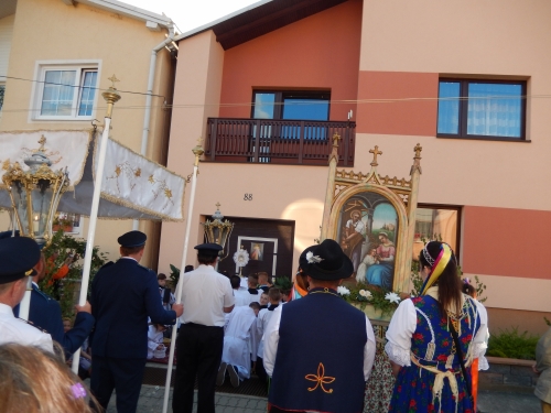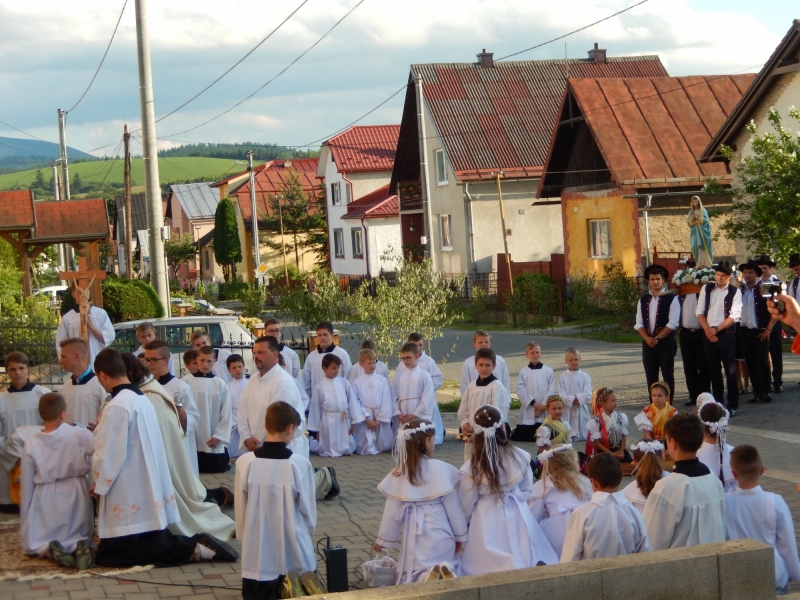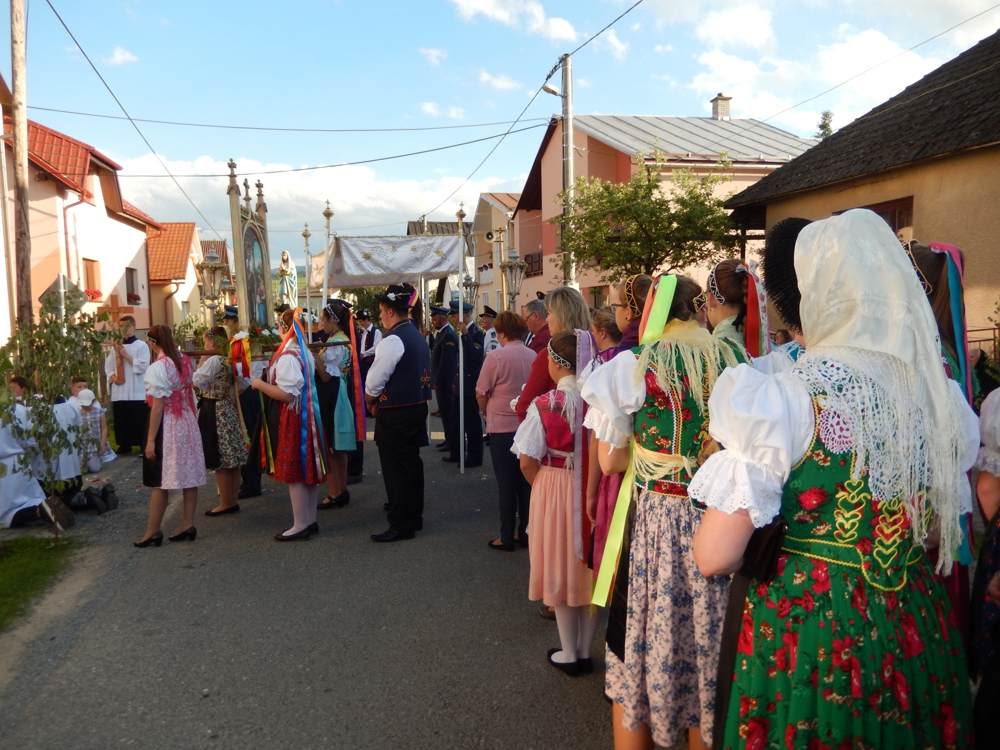 Dnes, vo štvrtok po sviatku Najsvätejšej Trojice, sme slávili sviatok Najsvätejšieho Kristovho tela a krvi, ktorý je známy ako Božie telo. Tento prikázaný sviatok je oslavou daru Eucharistie a vyjadrením úcty k Spasiteľovi prítomnému pod spôsobom chleba a vína vo Sviatosti oltárnej. Svätá omša sa začala o 18.00 hodine. Po svätej omši začala procesia. Vsdp. Tomáš Gondkovský v slávnostnom sprievode niesol monštranciu s kúskom premeneného chleba cez dedinu. Deti na znak úcty a lásky k Bohu rozsýpali na cestu lupene kvetov. Sprievod sa zastavil pri štyroch oltároch symbolizujúcich štyri svetové strany. Dievčatá a chlapci v krojoch niesli obrazy a sochu Panny Márie. Hasiči niesli baldachýn nad monštranciou. Krojovaný sprievod bol jeden z najkrajších za posledné roky.