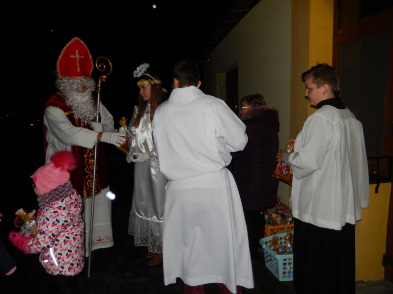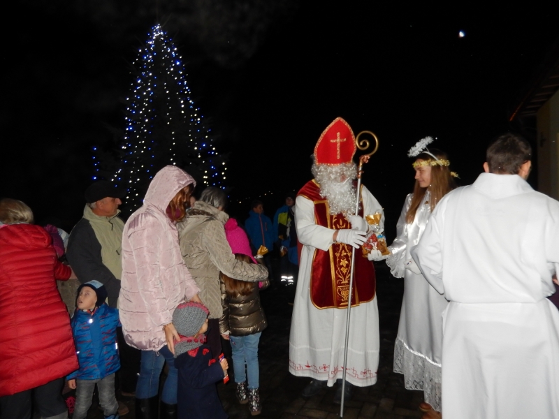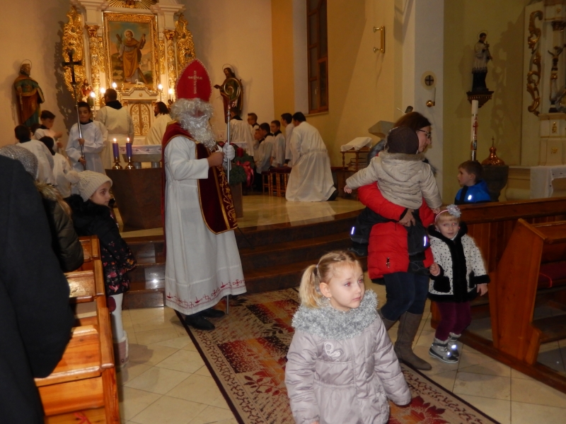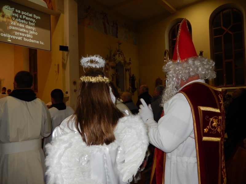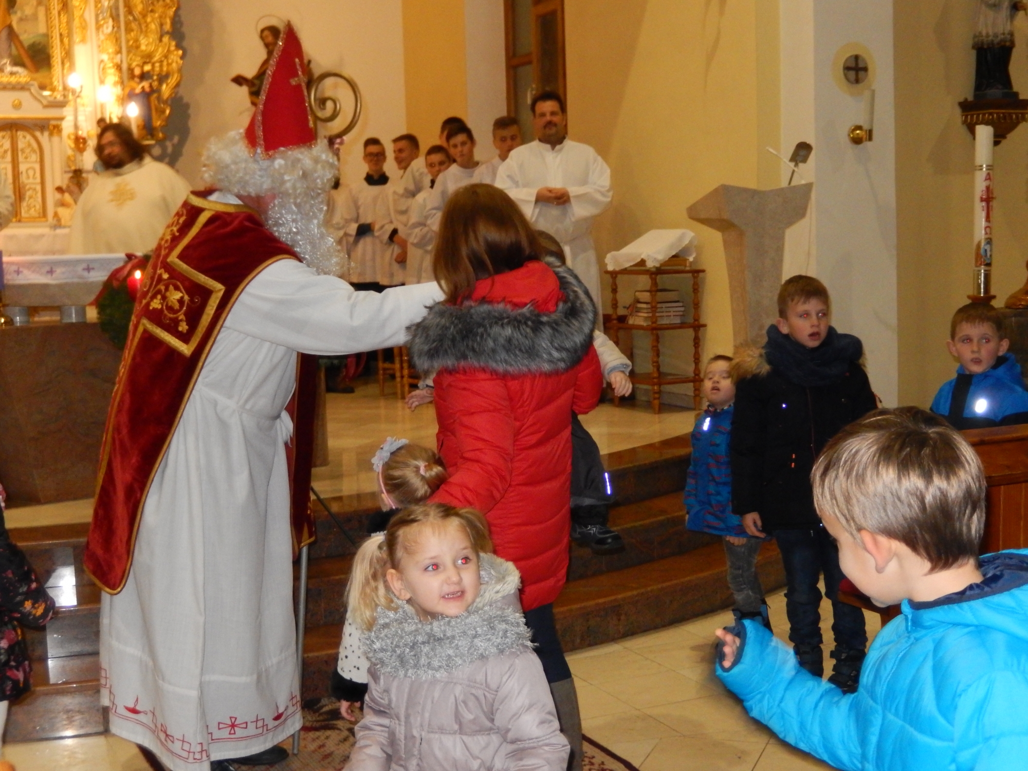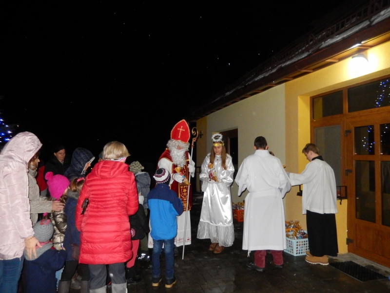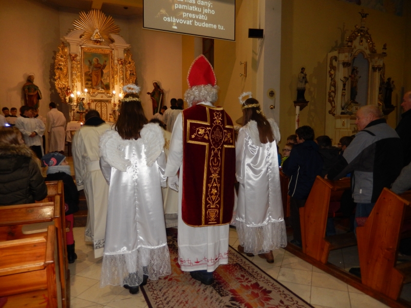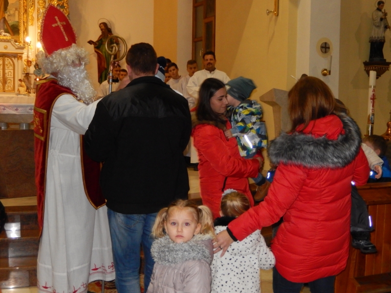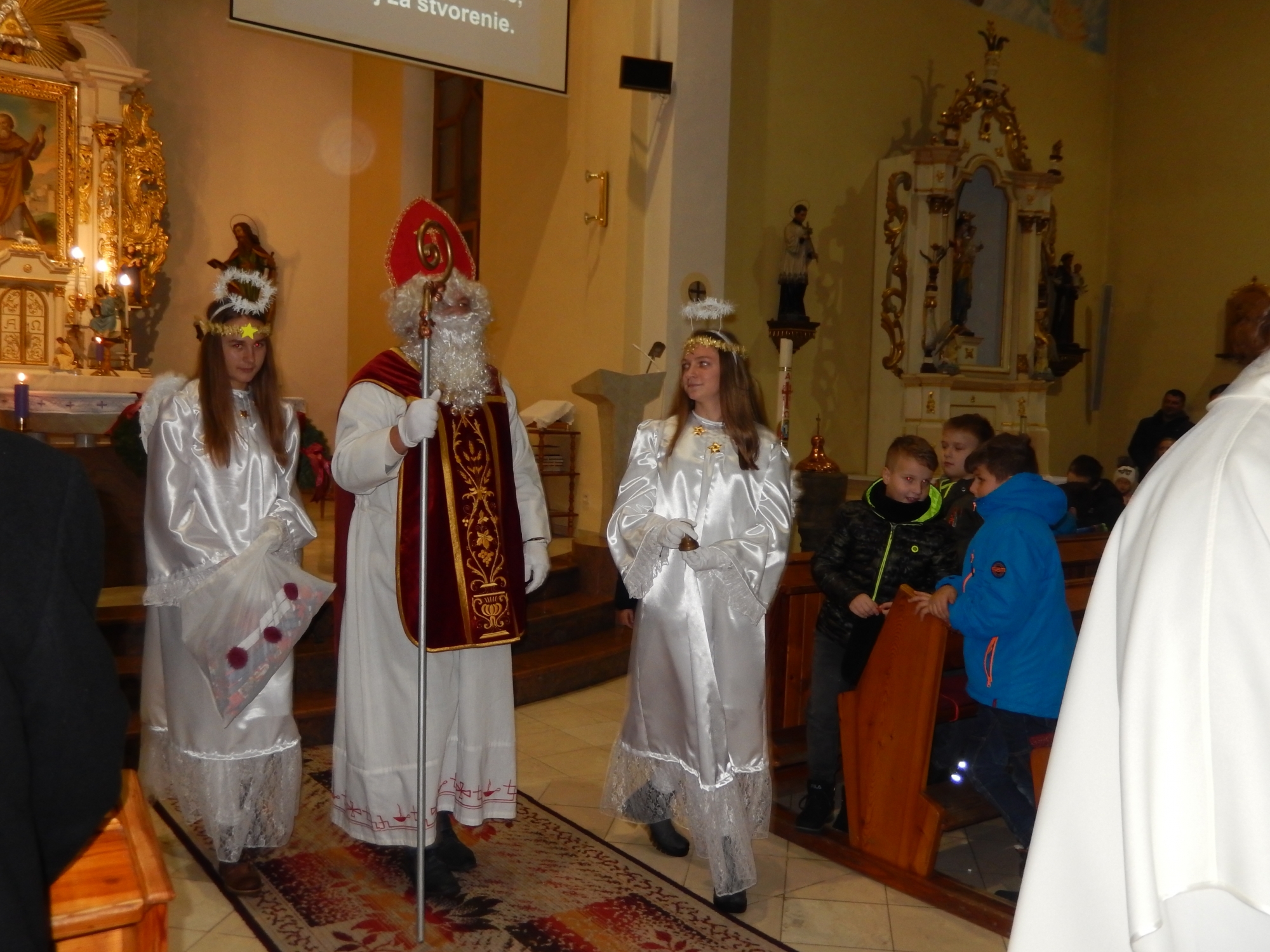 Svätý Mikuláš prišiel na svätú omšu. Tešíl sa koľko veľa detí prišlo,aby sa s nim stretlo. Na kostolnom dvore rozdal prítomným deťom balíčky.