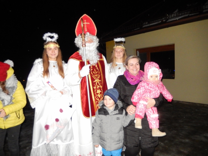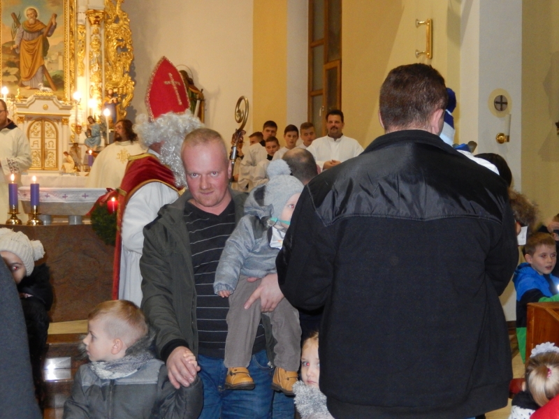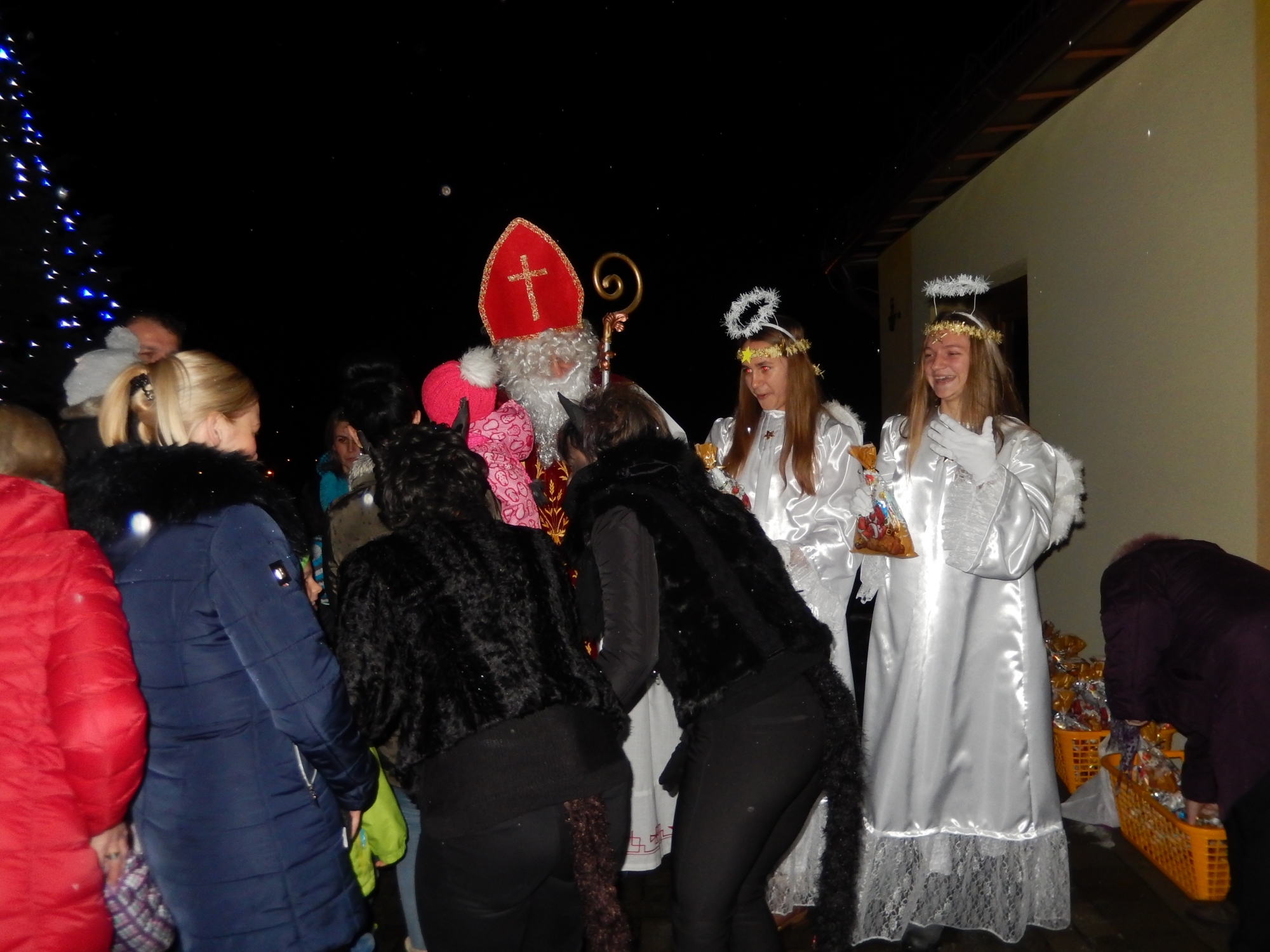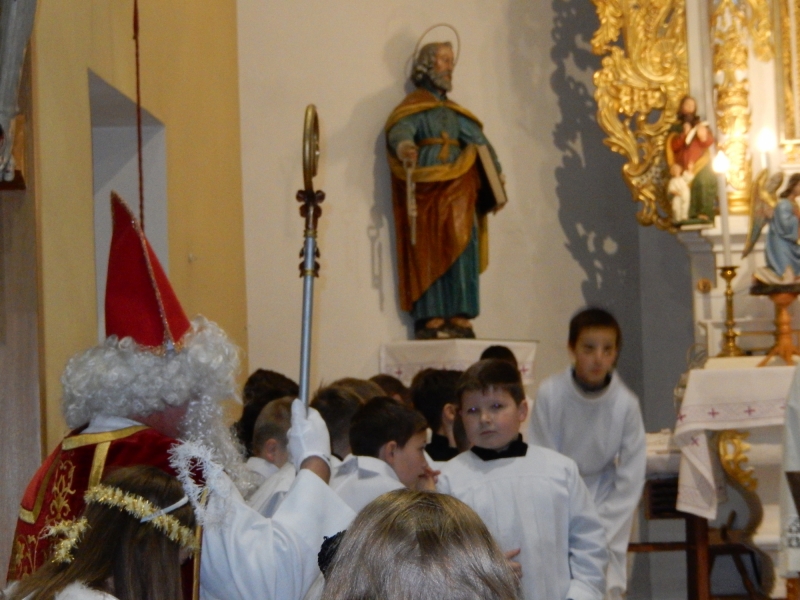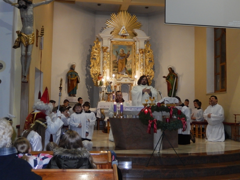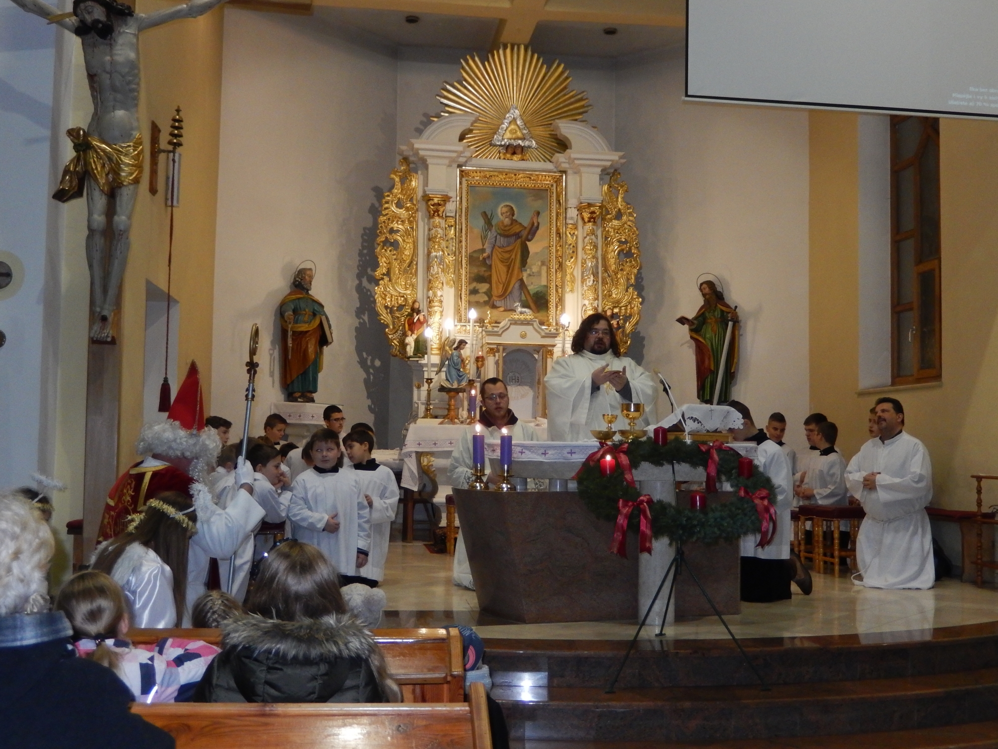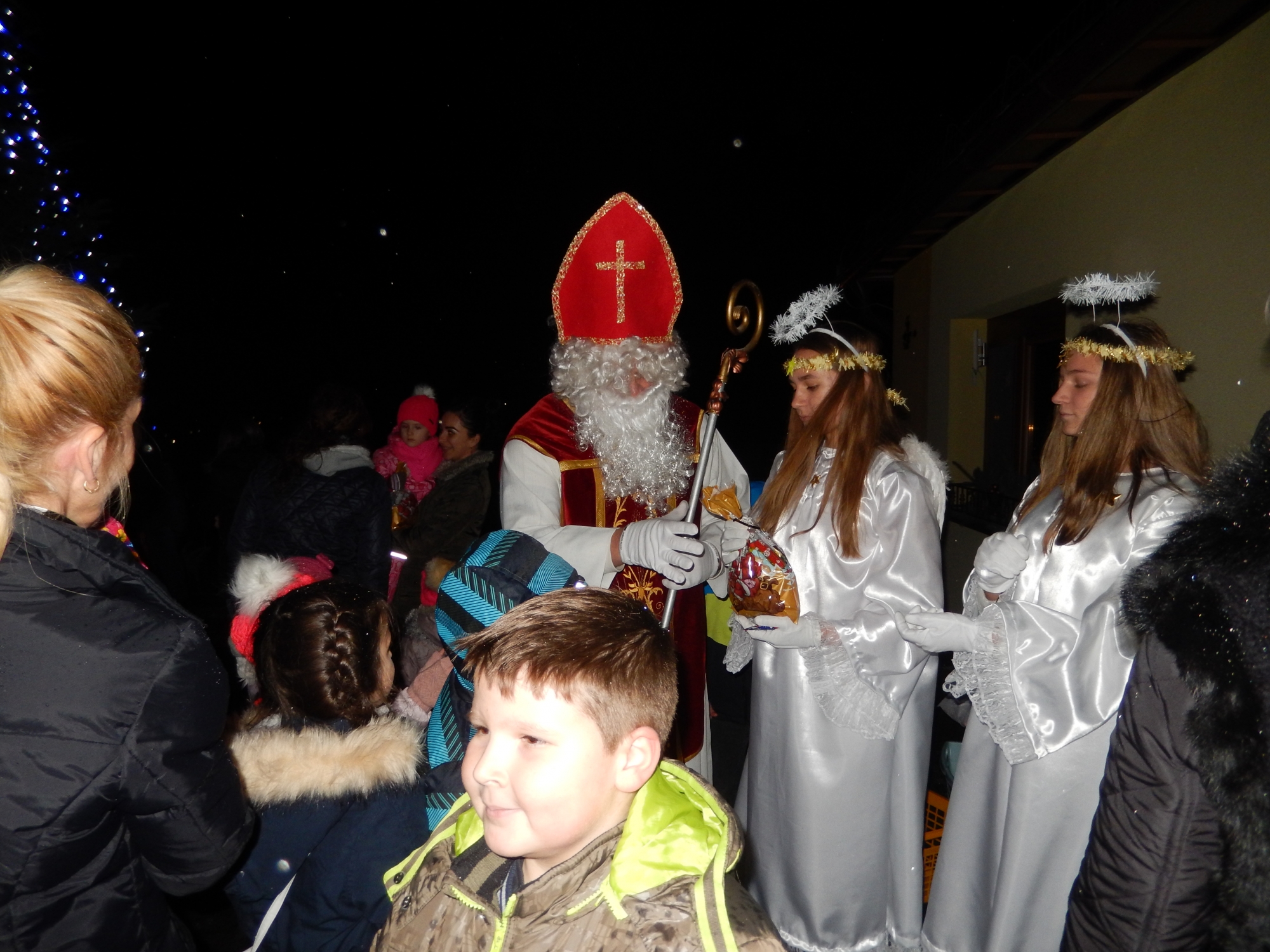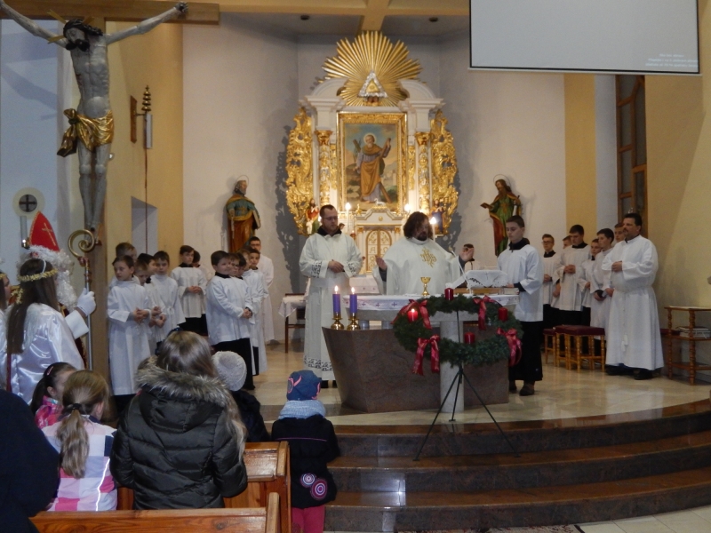 Svätý Mikuláš prišiel na svätú omšu. Tešíl sa koľko veľa detí prišlo,aby sa s nim stretlo. Na kostolnom dvore rozdal prítomným deťom balíčky.